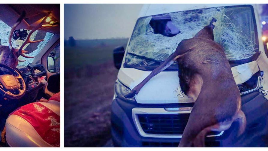Do kolejnego groźnie wyglądającego zdarzenia doszło dziś (28.11) na krajowej 63 w Pustelniku. Wprost pod nadjeżdżającego Peugeota na drogę wybiegł jeleń. Niestety pomimo starań kierowcy nie udało się uniknąć zdarzenia, a zwierzę przebiło przednią szybę busa i wpadło do kabiny. Kierujący peugeotem z obrażeniami ciała został przewieziony do szpitala. Zwierzę padło na miejscu.