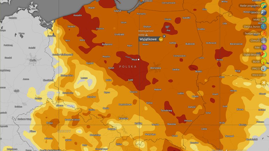 1. Mapa intensywności suszy: Nasz region jest zaznaczony najciemniejszym odcieniem brązu. Status "Wyjątkowe" to nie tylko etykieta w aplikacji Windy – to sygnał, że mamy do czynienia z ekstremum, które statystycznie zdarza się rzadko, a u nas staje się nową normą.