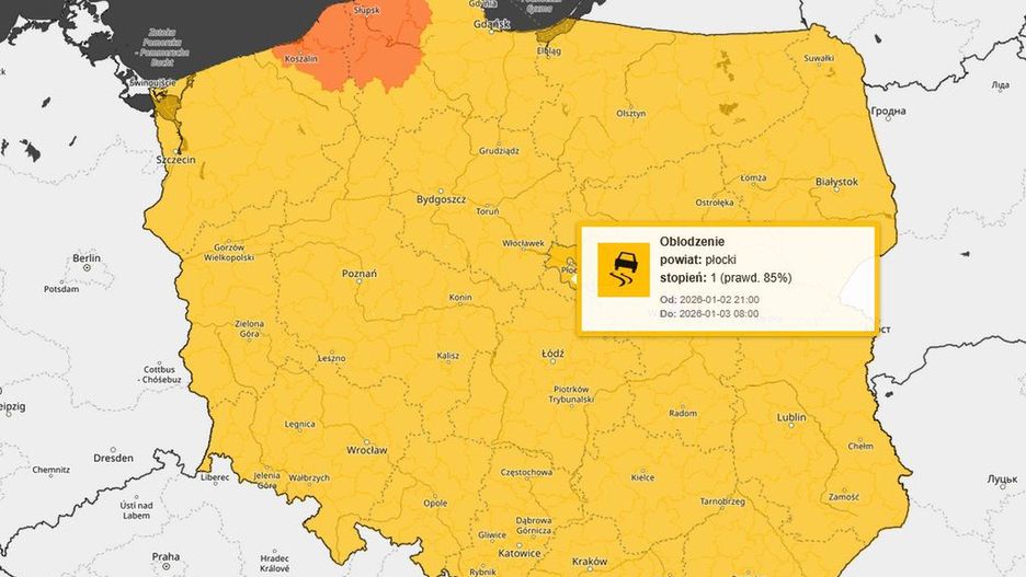 Ostrzeżenie obowiązuje od godz. 21:00 w piątek 2 stycznia do godz. 8:00 w sobotę 3 stycznia 2026 r.