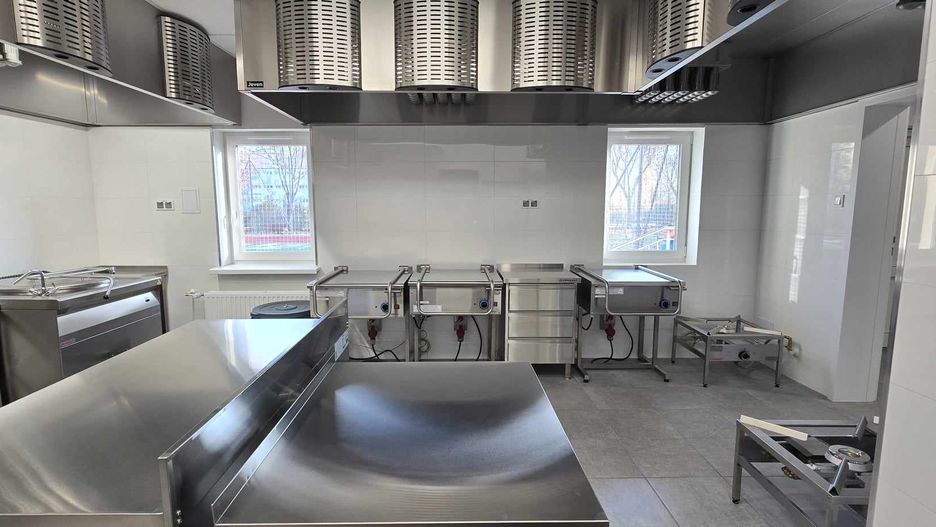 Prace były kompleksowe – po ułożeniu wszystkich instalacji i podłóg, zamontowaniu drzwi, podłączeniu wentylacji oraz pomalowaniu ścian, został wstawiony specjalistyczny sprzęt kuchenny. Są tu między innymi potężne okapy kuchenne z filtrami i łapaczami tłuszczu, piece konwekcyjno-parowe, zmywarki, lodówki i szafy chłodnicze. Jest też mniejszy sprzęt, jak: szatkownica do warzyw, mikser planetarny, mieszarka do farszu, niezbędny do przyrządzania potraw. Trwają ostatnie odbiory i za kilka dni kuchnia zacznie serwować obiady. Ta inwestycja kosztowała prawie 2,7 mln zł.