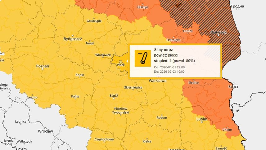 Wydano ostrzeżenie meteorologiczne pierwszego stopnia przed silnym mrozem dla Płocka i powiatu płockiego. Najbliższe noce mogą przynieść bardzo niskie temperatury, które stanowią zagrożenie dla zdrowia ludzi oraz mogą powodować utrudnienia w codziennym funkcjonowaniu.