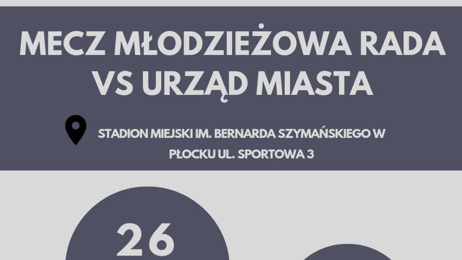 W piątek 26 kwietnia na Stadionie Miejskim im. Bernarda Szymańskiego przy ul. Sportowej 3 – Młodzieżowa Rada Miasta Płocka zmierzy się w meczu piłki nożnej z drużyną Urzędu Miasta. Początek imprezy o godz. 17.
