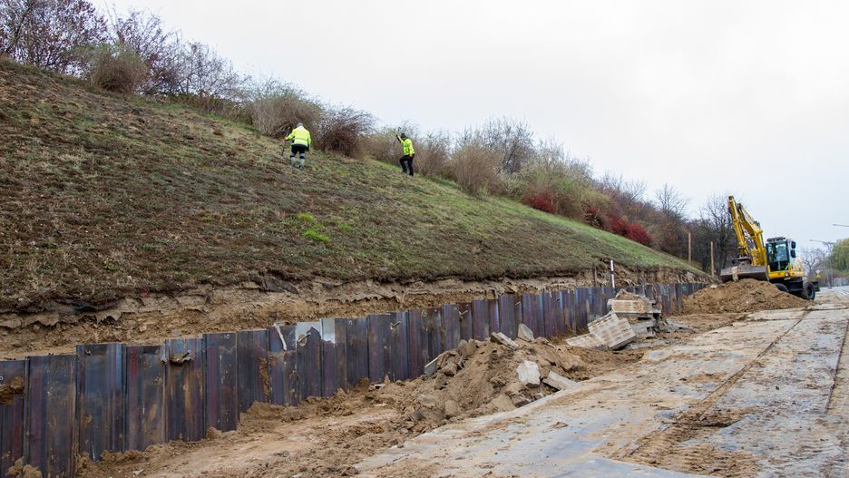 Na jej szczyt "założony" zostanie betonowy oczep, który można porównać do betonowego kołnierza. I zaczepione zostaną o niego zapuszczone 10 metrów w głąb skarpy stalowe pręty – kotwy samowiercące wnikające w skarpę. Będą one trzymać ściankę niczym liny cumujące np. jacht w porcie, by "nie odpłynęła" i nie przewróciła się pod naporem gruntu.